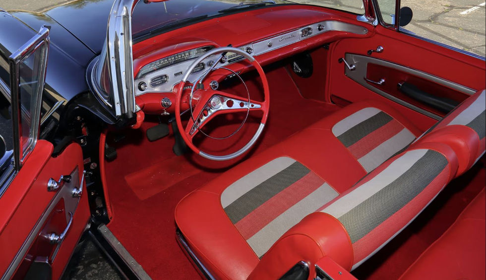 The body is refinished in its original Onyx Black paint, accented by the year’s Impala-level premium chrome trim and a contrasting power-operated white convertible top. The interior is handsomely done in tri-tone red, black and silver vinyl and cloth seating, with options including the Wonderbar radio, chromed full-horn-ring steering wheel, an in-dash clock, a column-operated shifter and a rear seat Impala emblem.